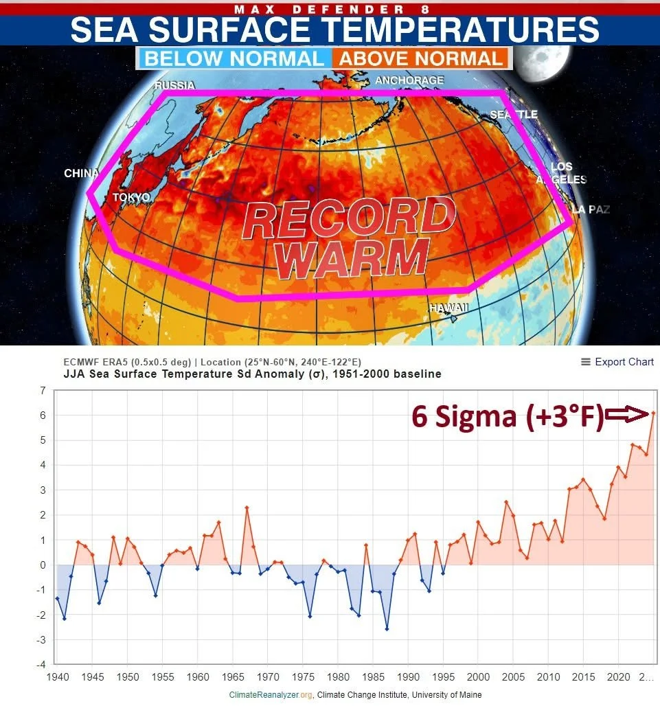 It's hard to overstate just how off the charts warm the Pacific is right now. The swath of the basin from California to Japan (a HUGE area) from 25N to 60N is ~3F (1.6C) above normal. To put it into math terms that is 6 Sigma/ standard deviations above the mean. I won't bother calculating the chances of this happening against the late 20th century climate - let alone the pre-industrial climate - because the numbers would show it simply could never happen without global warming.